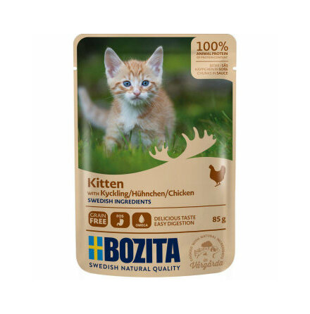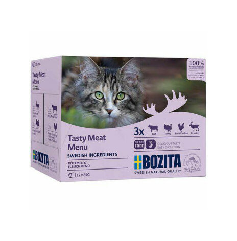 Bozitas multibox med 12 st små påsar 85 g styck innehåller svenska produkter från start till mål. Detta är ett helfoder eller fullfoder för katter. En blandning av påsar med Ren, Kalkon, Nöt, kyckling