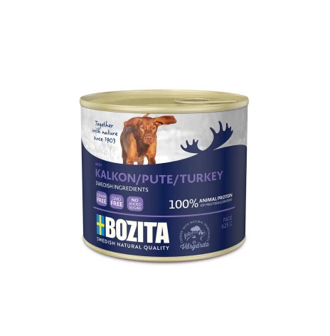 Bozita våtfoder paté med kalkon är ett spannmålsfritt våtfoder för hundar som kan användas som helfoder eller som topping på torrfodret . Svenska ingredienser och smaker, 100% animaliskt protein (av proteininnehållet) kalkonen i Bozita paté med kalkon kommer från uitvalda svenska bönder.