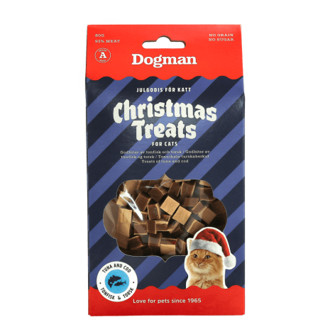Smarrigt kattgodis med jultema. Högt innehåll av kött från torsk och tonfisk. Inget socker eller spannmål tillsatt