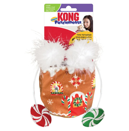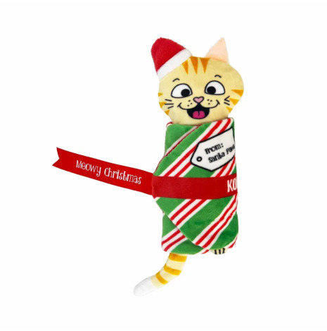 Kattleksak en mjuk katt inlindad i en julfilt för att ge katten möjlighet att anvnda sin jakt instinkt att få fram och leka med den mjuka katten inuti. Långa snören föryyterligare locka till lek