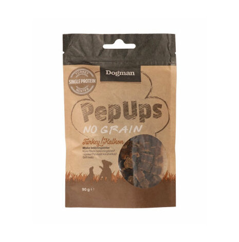 Uppmuntra din hund vid träning eller helt enkelt endast som lite godis då och då. Pepups är små, lite mjuka bitar med smak av kalkon. Detta kanske blir din hunds favoritgodis. Lågt energiinnehåll och inget spannmäl. Våra egna hundar bara älskar pepups.