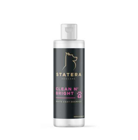Näringsrikt och effektivt schampo, utvecklat för vit och ljus päls. STATERA Clean n’ Bright, minskar gulfärgning av vit och ljus päls och bidrar till ljusare/klarare färg. Med sina noga utvalda ingredienser och fokus på att anpassa sig efter hundens naturliga pH-värde i huden är Clean n’ Bright ett effektivt och skonsamt val för hunden.