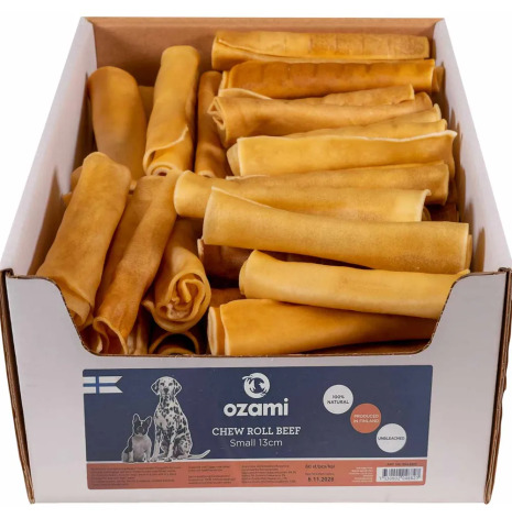 En robust tuggrulle av nöthud som handrullas med fokus på kvalitet och trygghet. Varje rulle rullas för hand av ett finskt familjeföretag med genuin hantverkskunskap. Huden lufttorkas och rullas utan kemiska tillsatser eller blekning. Råvarorna hämtas främst från Norden, men kan kompletteras med noga utvalda råvaror från EU vid behov. Resultatet är en naturlig tuggprodukt som passar hundar som gillar att tugga länge och som föredrar rena, obehandlade råvaror.