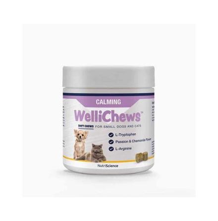 WelliChews® Calming är mjuka tuggbitar för små hundar och katter, som kan stötta vid stress, ångest och oro hos sällskapsdjur. WelliChews Calming innehåller L-tryptofan som kan öka serotoninhalten, L-arginin för att stötta produktion av kväveoxid samt passions- och kamomillblommor som kan hjälpa till med att lugna nervsystemet. Tuggbitarna kan lindra vid stress, separationsångest eller reseångest.