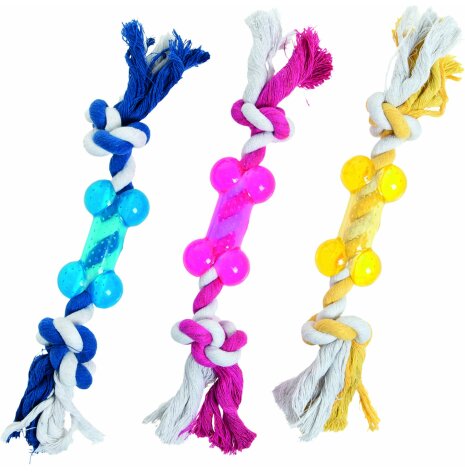 Litet gummiben passande till valp eller liten hund. Flyter, piper och har härliga knutar av rep.